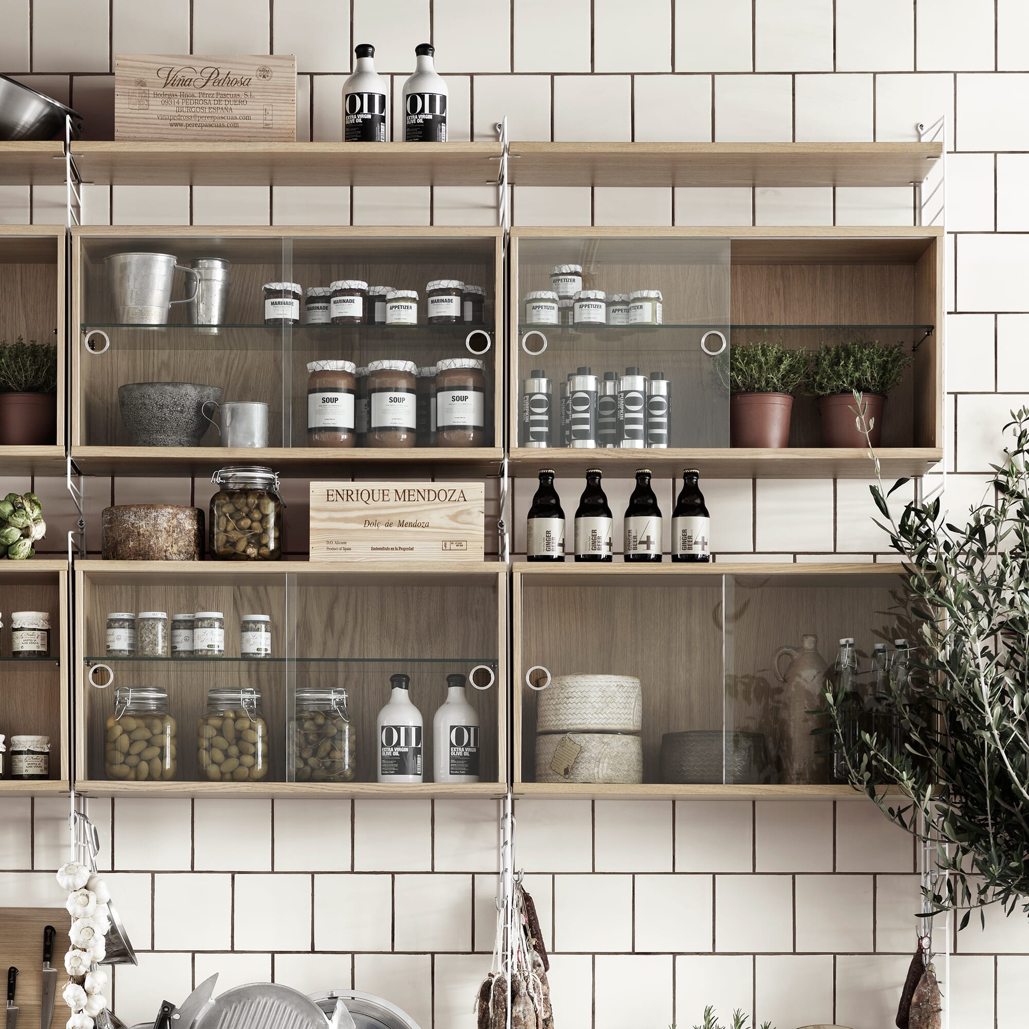 STRING skap med glassdører til String hyllesystem designet av Nils Strinning i 1949. Skapet hektes lett inn på String gavler. Slik er det enkelt å skreddersy ditt helt unike system og endre oppsettet etter behov. Skapets glassdører gir en vakker, men støvfri innramming til det du ønsker å vise, som bestemors servise eller andre verdifulle skatter.