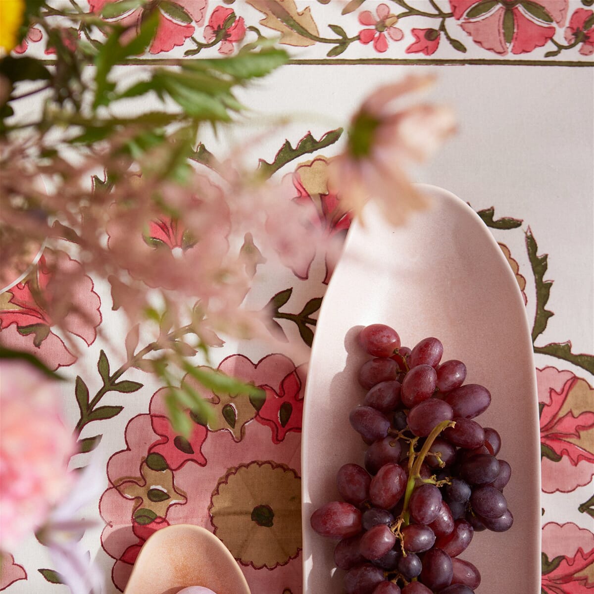 Rosette Rose Bordduk fra Bungalow - en blendende blanding av tradisjonell indisk håndverk og moderne eleganse. Vår bordduk er håndtrykt av dyktige indiske håndverkere, laget av førsteklasses 100% bomullsstoff, som gir en følelse av luksus og kvalitet.