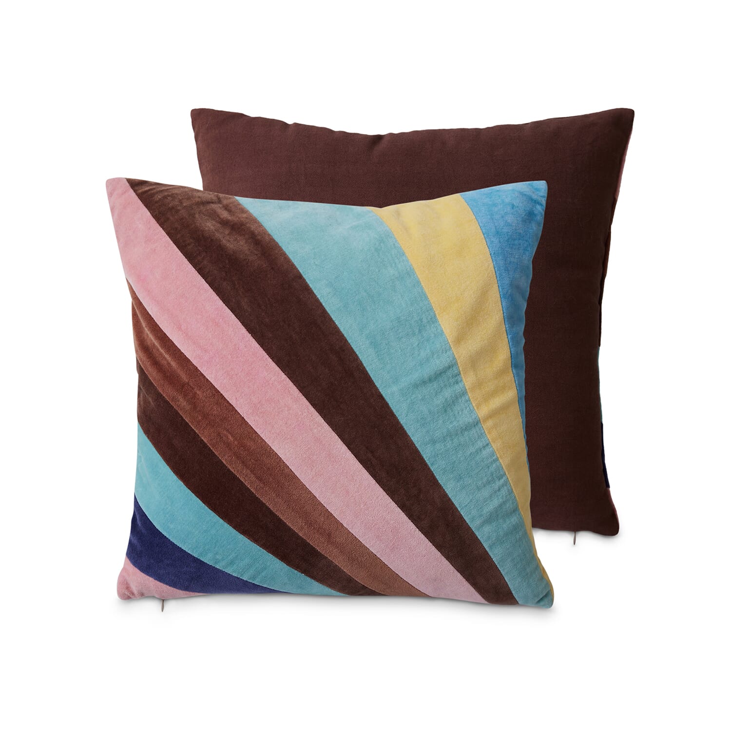 Denne puten, Velvet Cushion Eventide, måler 45 x 45 cm og er laget av myk bomull. Med sine livlige, diagonale striper i kontrasterende farger, tilfører den umiddelbart et fargerikt og elegant uttrykk til stuen, soverommet eller andre områder i hjemmet. Det fløyelsmyke materialet gir ikke bare visuell appell, men også en luksuriøs følelse og komfort. Denne puten er perfekt for å skape en sofistikert og innbydende atmosfære som komplementerer moderne og klassiske interiørstiler.