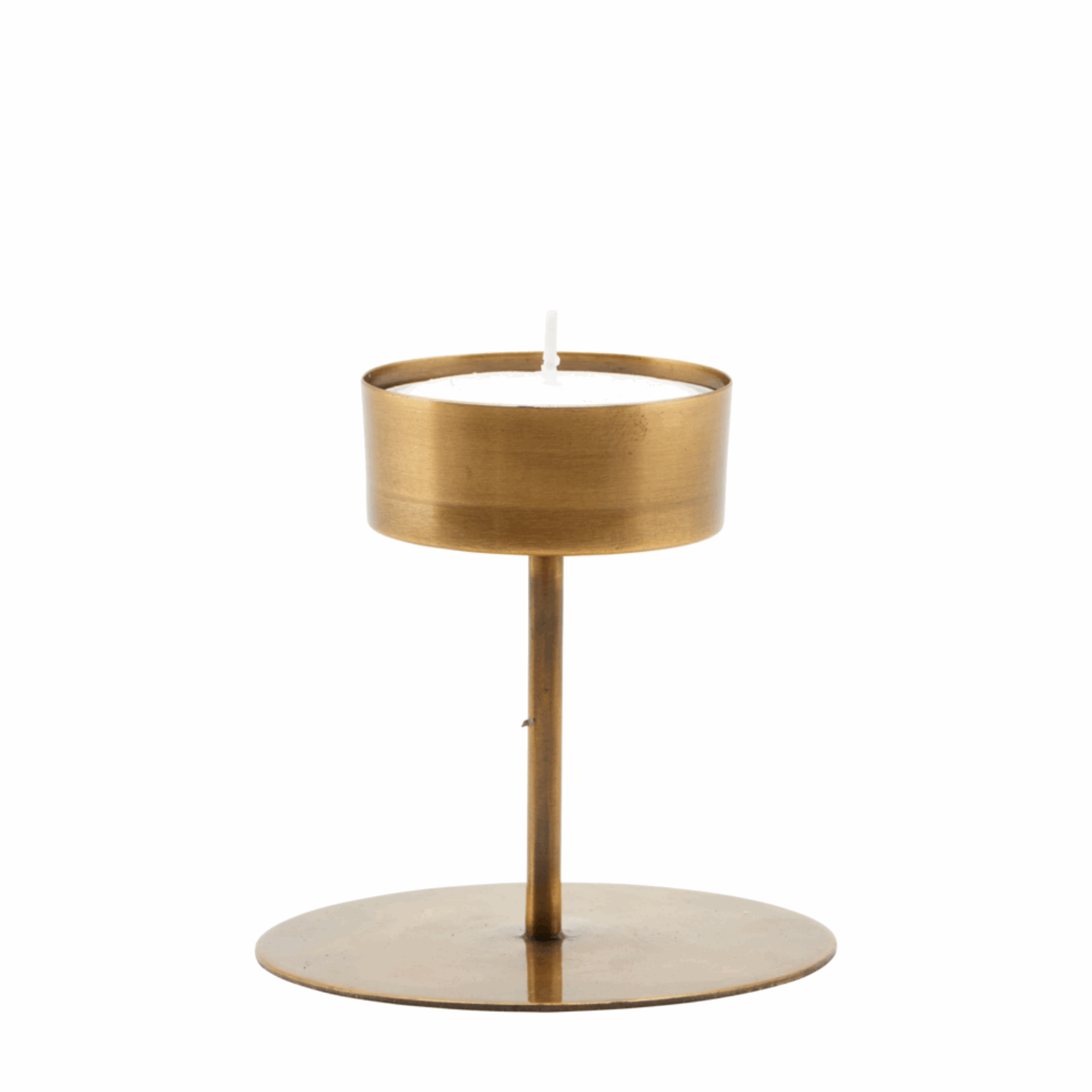 Denne stilrene lysestaken i antikk messingfinish og solid jern kombinerer rå materialitet med myke former. Resultatet er en dekorativ og tidløs lysholder som passer perfekt til både telys og små stearinlys.