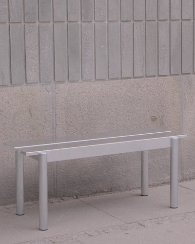 Benken er laget i pulverlakkert eller galvanisert stål, utviklet for å tåle utendørs bruk over tid. Overflaten er slitesterk og UV-bestandig, mens små åpninger i konstruksjonen sørger for effektiv drenering av vann. Varianten i galvanisert stål vil over tid utvikle en vakker, matt patina.