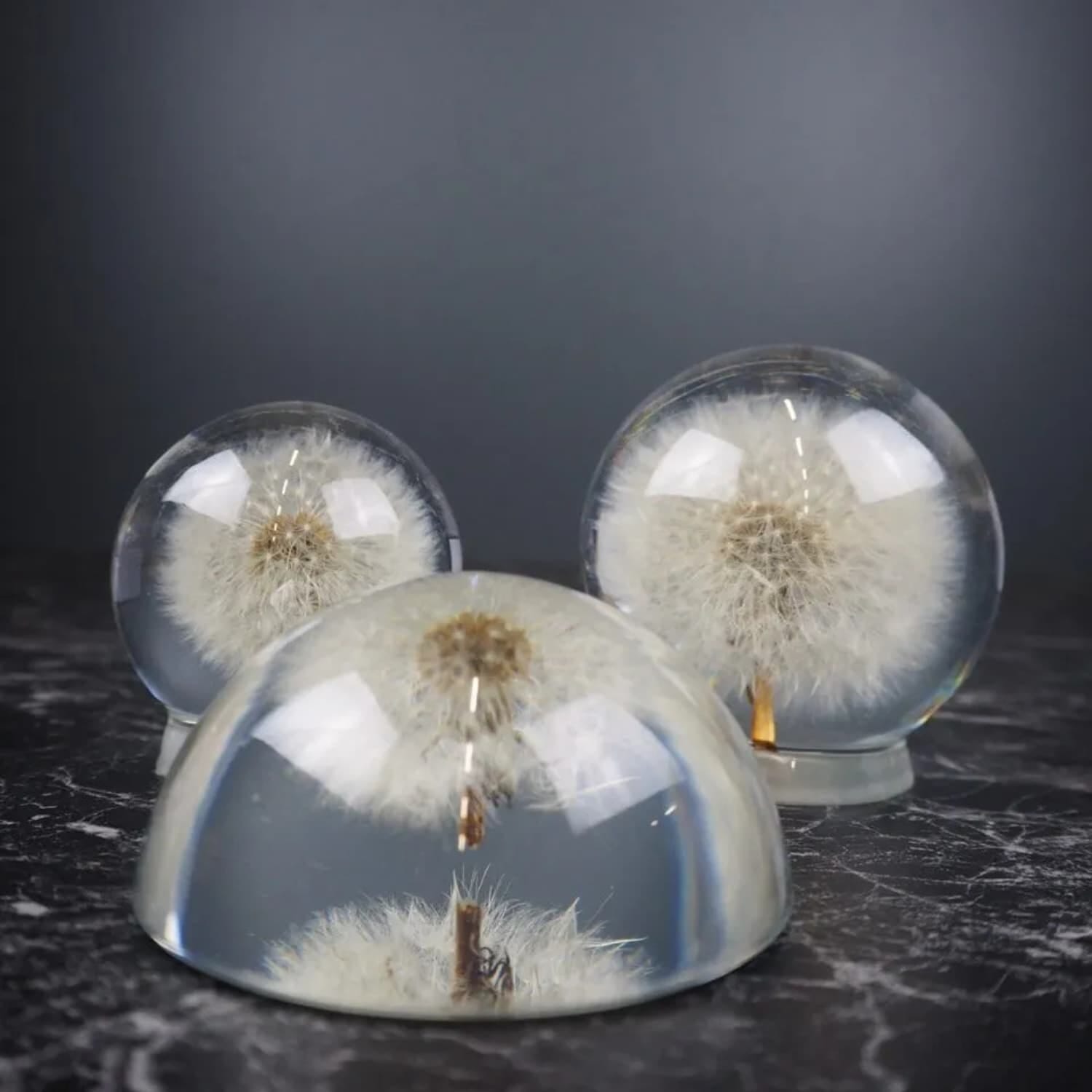 Papirvekt Løvetann 8 cm er et poetisk og funksjonelt skrivebordsobjekt hvor en ekte løvetann er foreviget i en krystallklar kule.