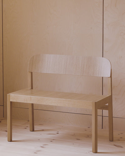 Workshop benk er en forlengelse av Workshop-stolen og er utformet som en liten 2-seter med skulpturell tilstedeværelse. Den passer perfekt i smale rom som entréen, ved spisebordet, langs en vegg i stuen eller som et rolig blikkfang i soverommet. Et allsidig møbel som inviterer til bruk – og til å bli sett.