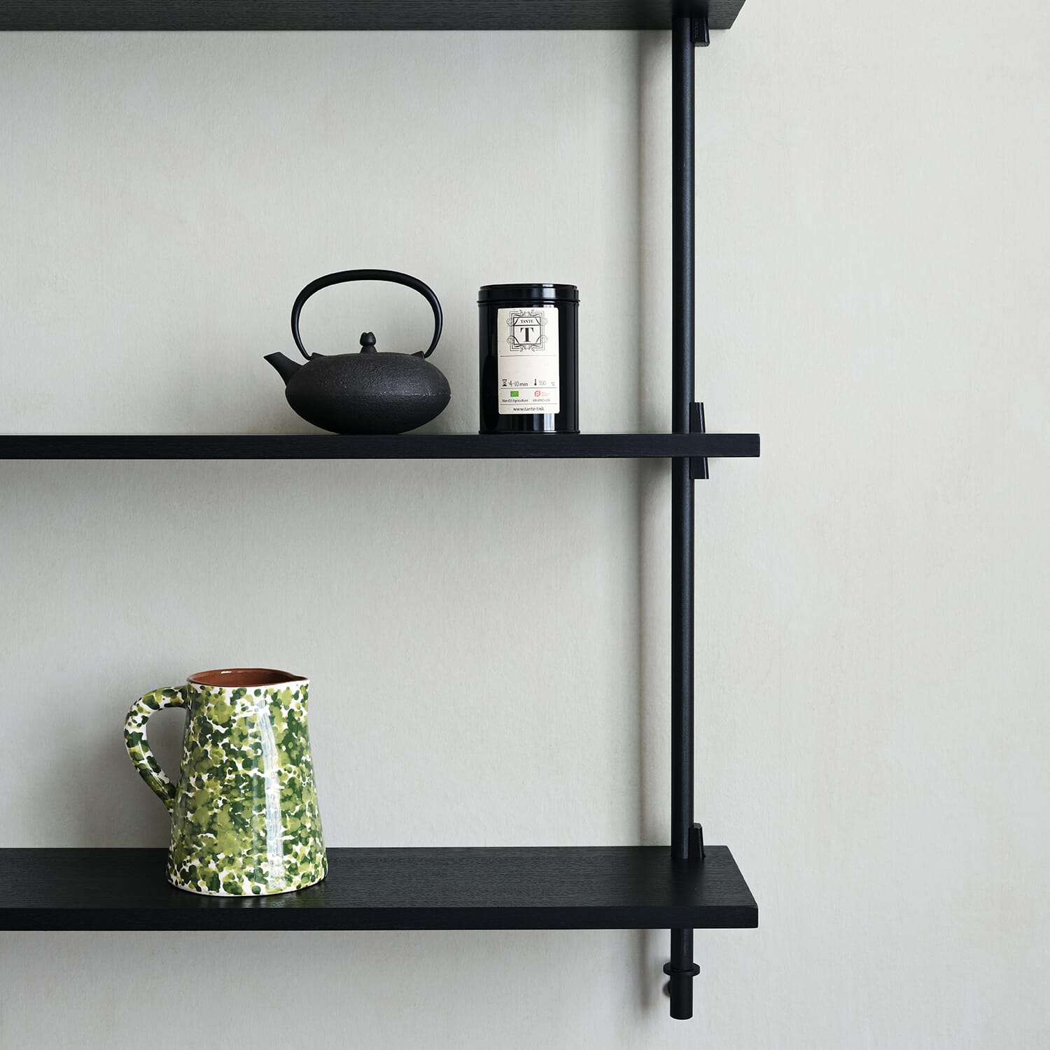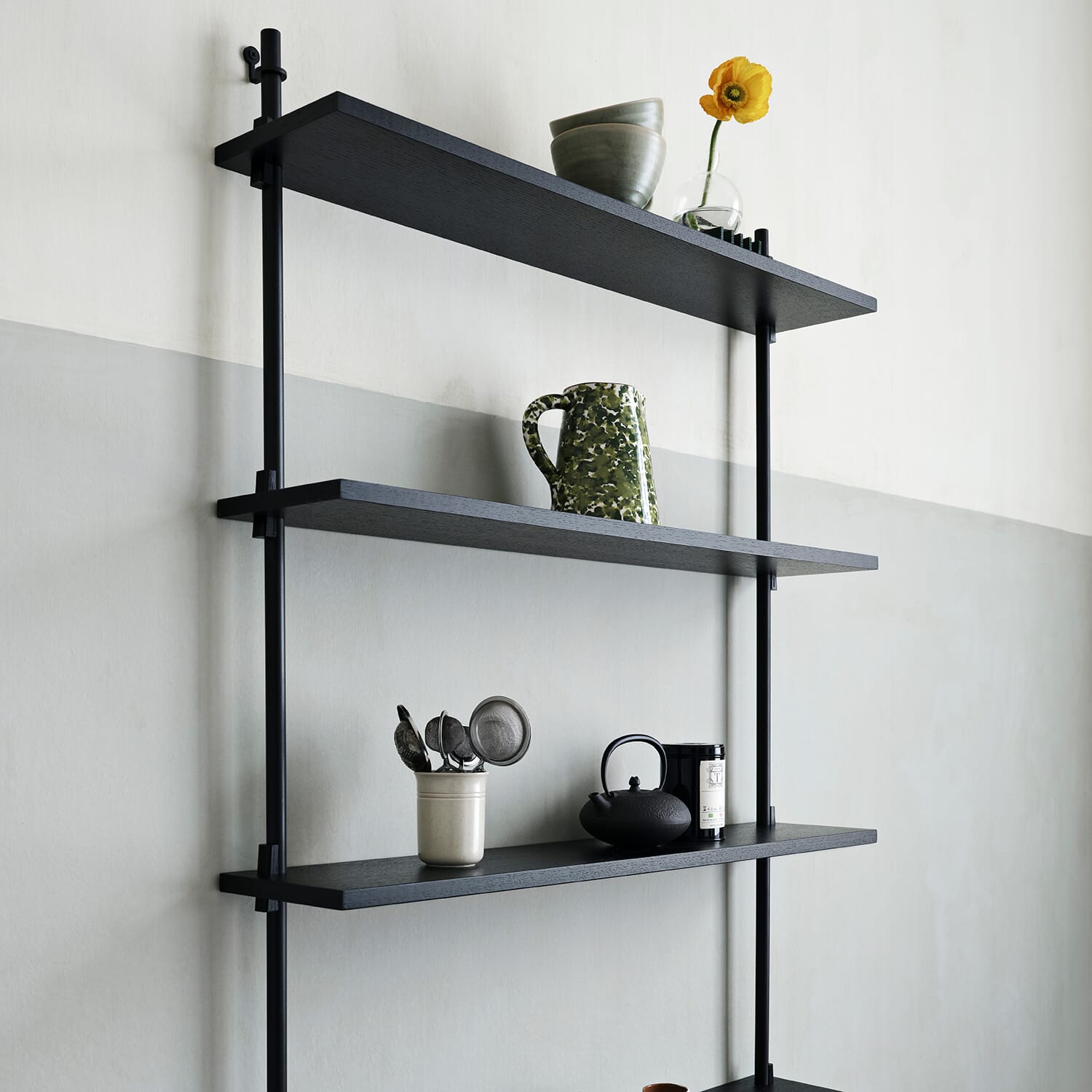 MOEBE Hyllesystem er skapt for å passe perfekt i både smale ganger og større oppholdsrom. Denne vegghyllen med fire hylleplater gir en stilren og funksjonell oppbevaringsløsning. Hyllesystemet kan brukes alene som en vegghengt løsning eller kombineres med gulvstående enheter for ekstra fleksibilitet. Med sitt modulbaserte design er systemet tilpassbart og kan enkelt utvides eller endres over tid, slik at det vokser med ditt hjem og dine behov.