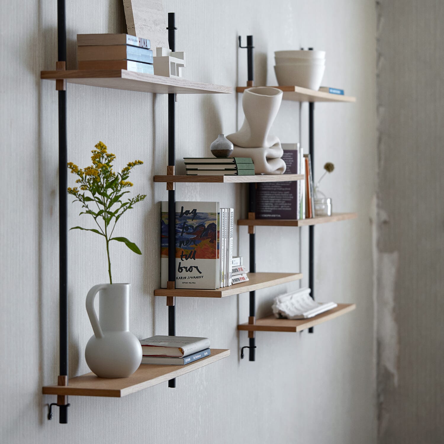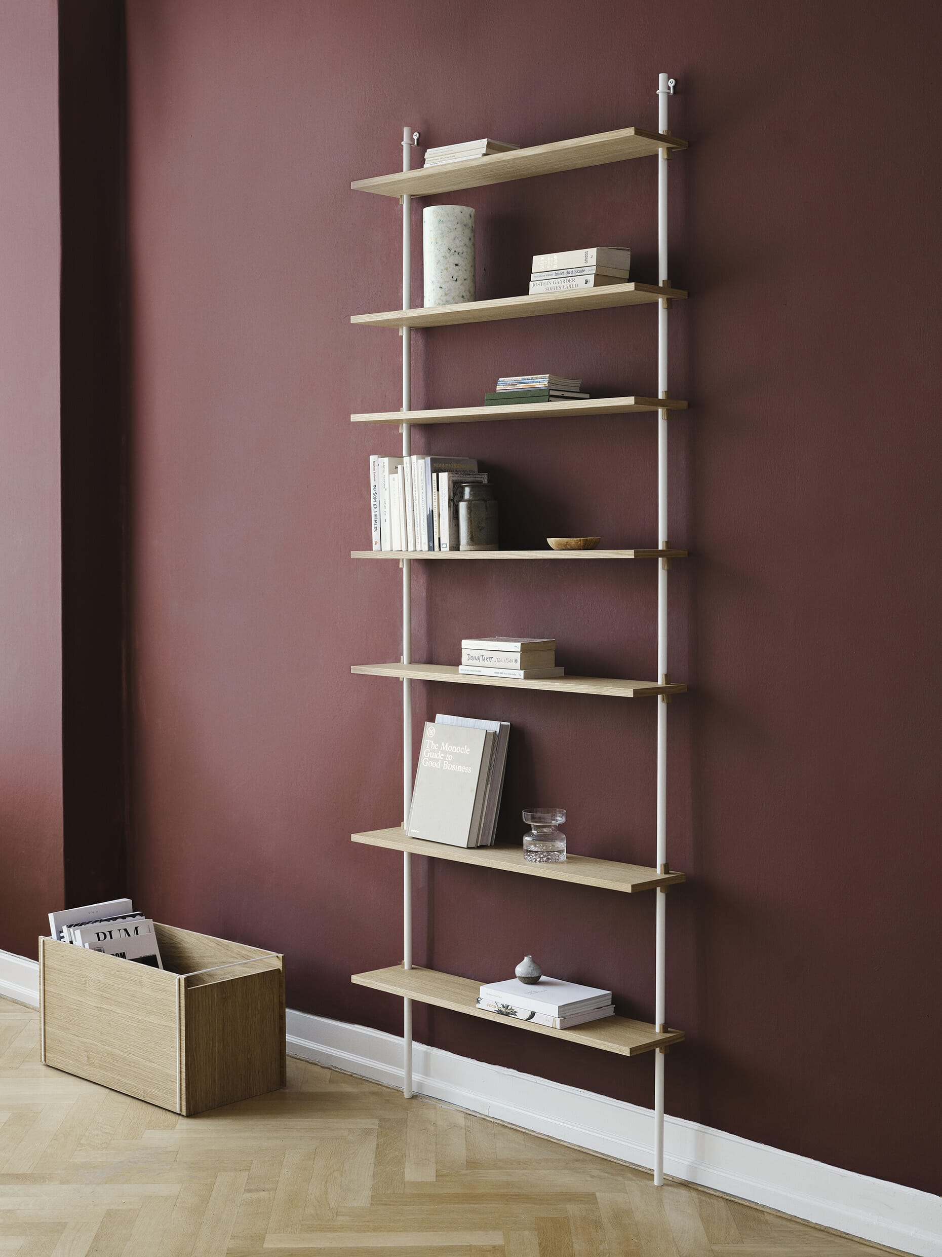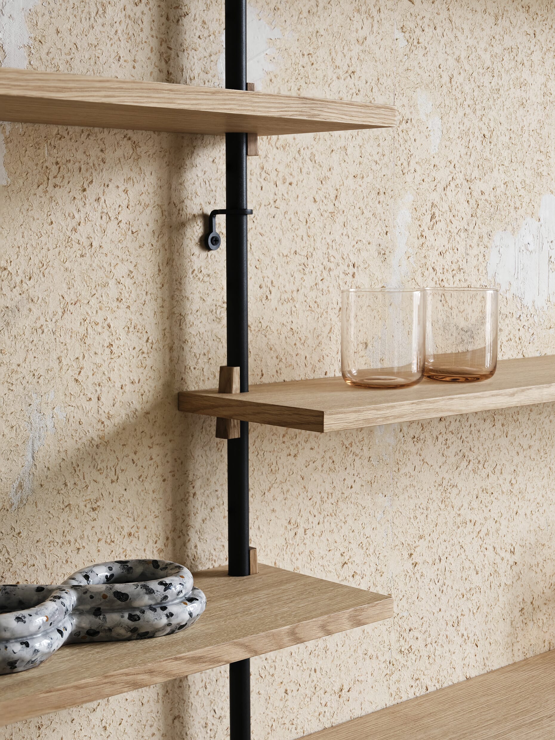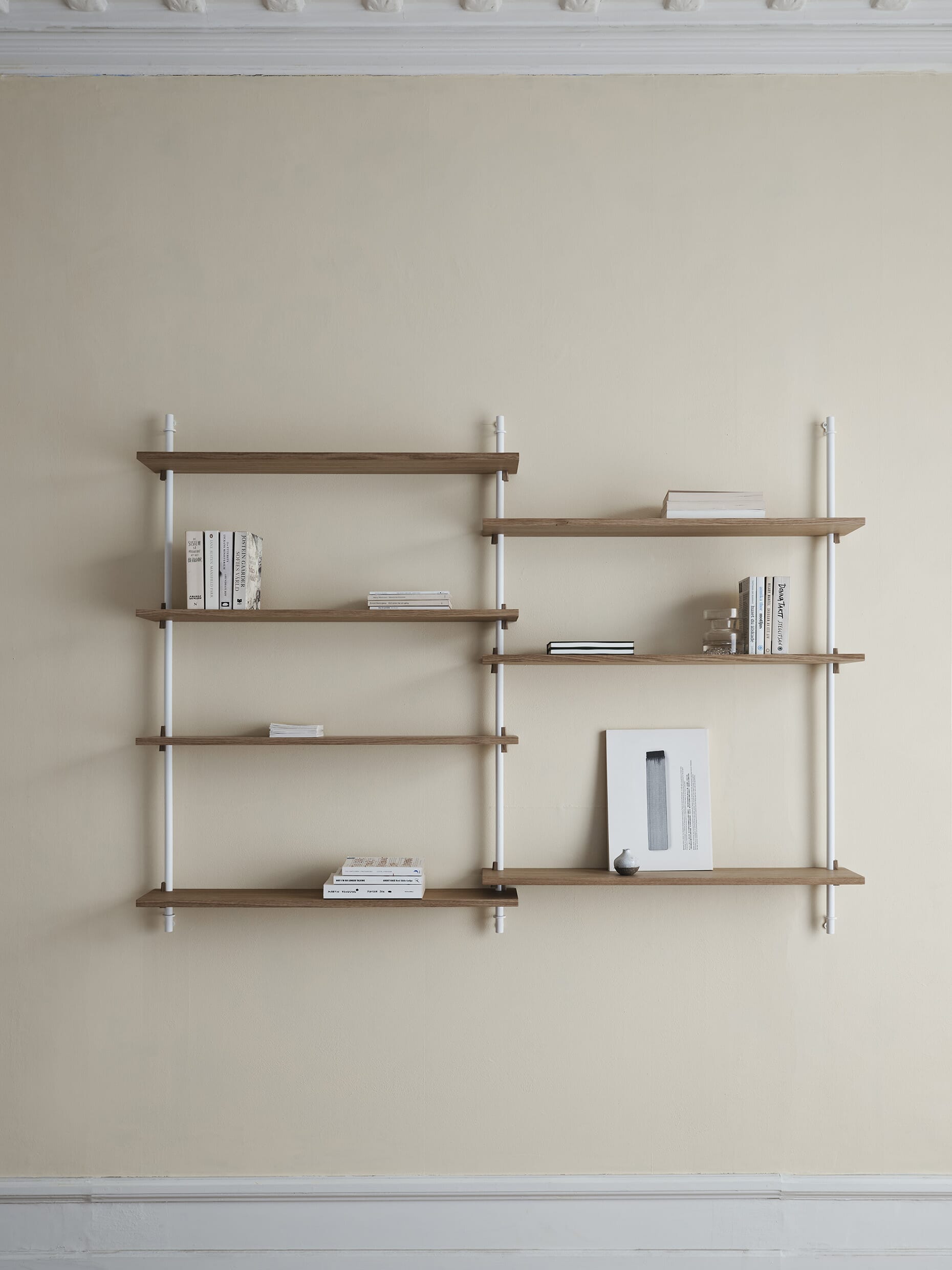 MOEBE Hyllesystem er skapt for å passe perfekt i både smale ganger og større oppholdsrom. Denne vegghyllen med fire hylleplater gir en stilren og funksjonell oppbevaringsløsning. Hyllesystemet kan brukes alene som en vegghengt løsning eller kombineres med gulvstående enheter for ekstra fleksibilitet. Med sitt modulbaserte design er systemet tilpassbart og kan enkelt utvides eller endres over tid, slik at det vokser med ditt hjem og dine behov.