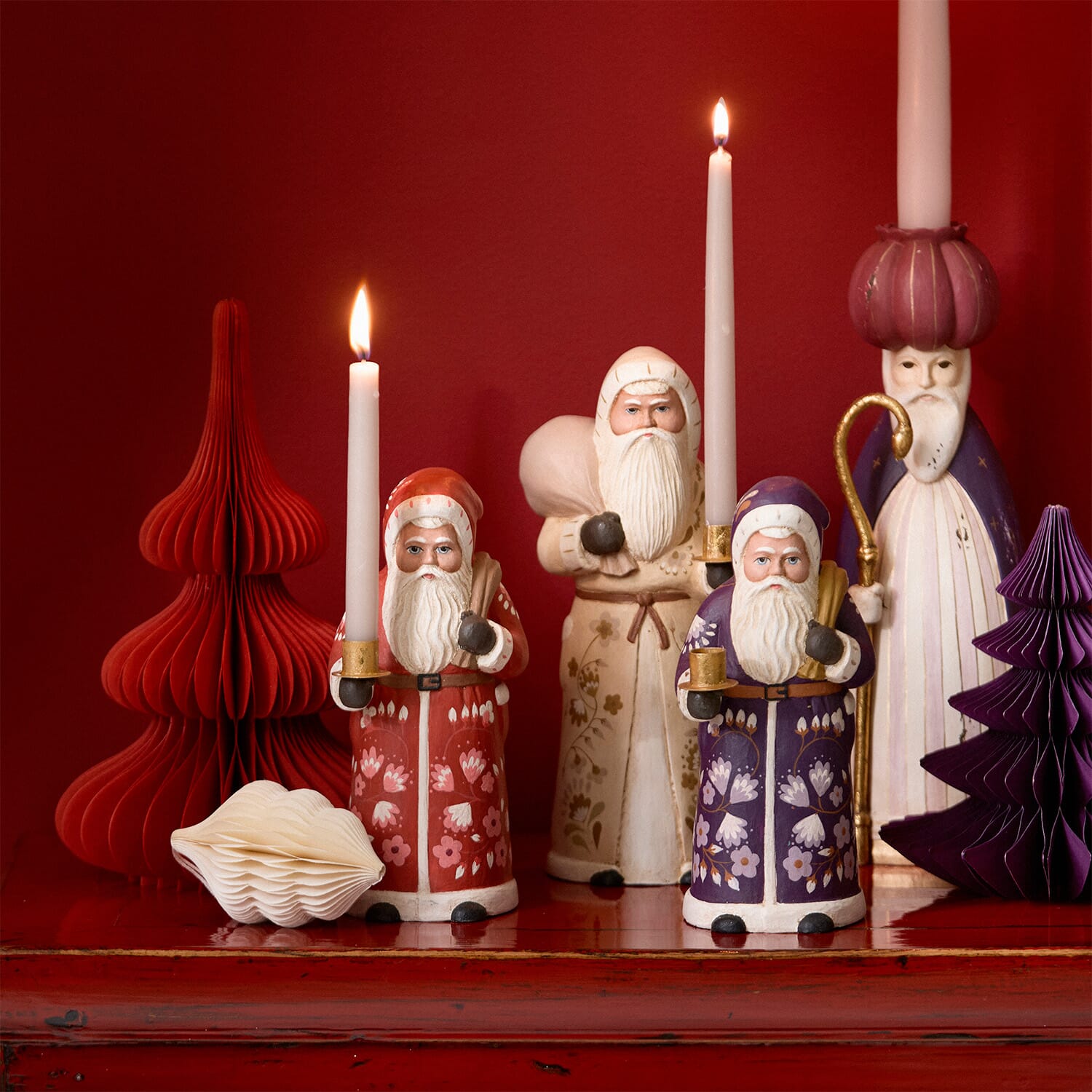 Gjør hjemmet ditt varmt og innbydende med vår Marigold Santa lysestake, håndstøpt og dekorert med intrikate, håndmalte detaljer i røde toner. Tilgjengelig i to størrelser og tre farger—rød, blå og beige—er disse lysestakene laget for å tilføre et snev av festlig eleganse og bli kjære arvestykker for familien i årene som kommer.