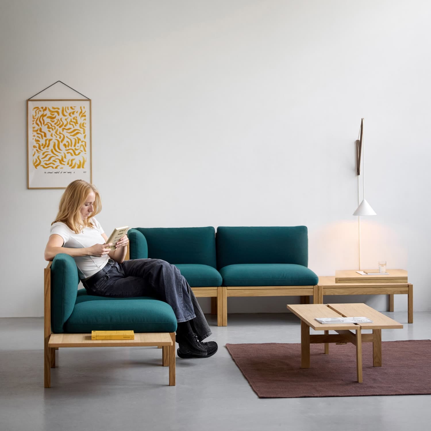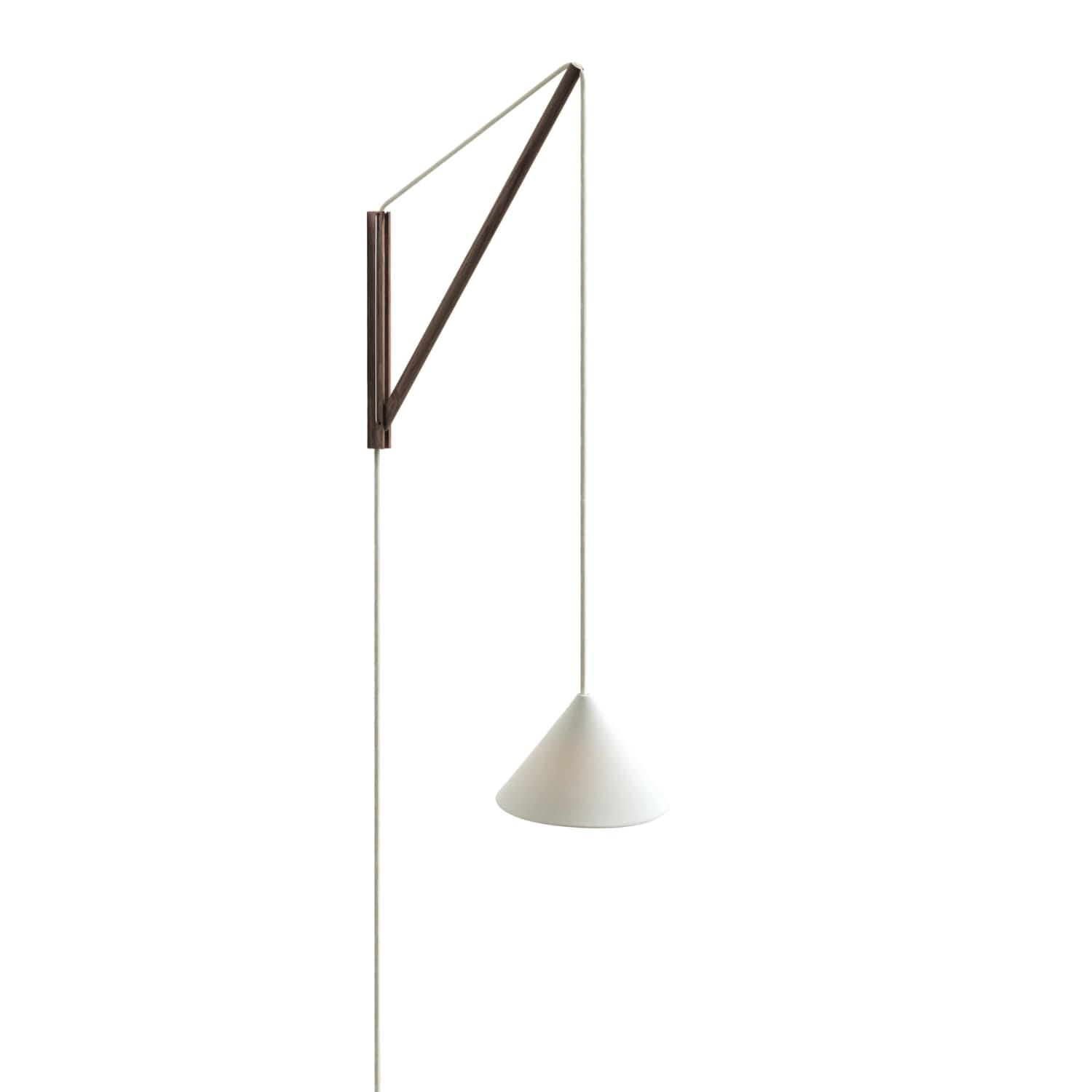 Lampen er bygget opp av fire deler: en solid veggbrakett i FSC-sertifisert røkt eik, en støttende wire i rustfritt stål, en bevegelig arm og en kabel med keramisk skjerm. Den gjennomtenkte konstruksjonen gjør det enkelt å justere både høyden på skjermen og avstanden fra veggen, slik at du kan skape riktig lyssetting for alt fra lesekrok til stemningsfull belysning i stue eller soverom.