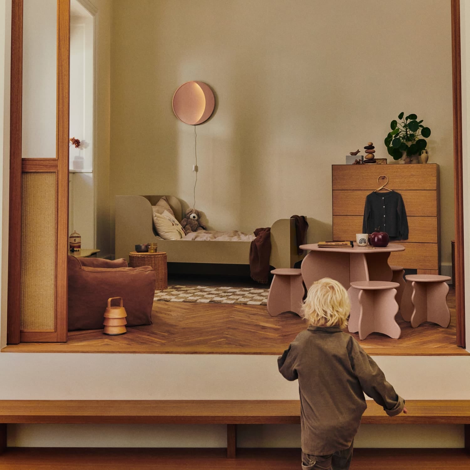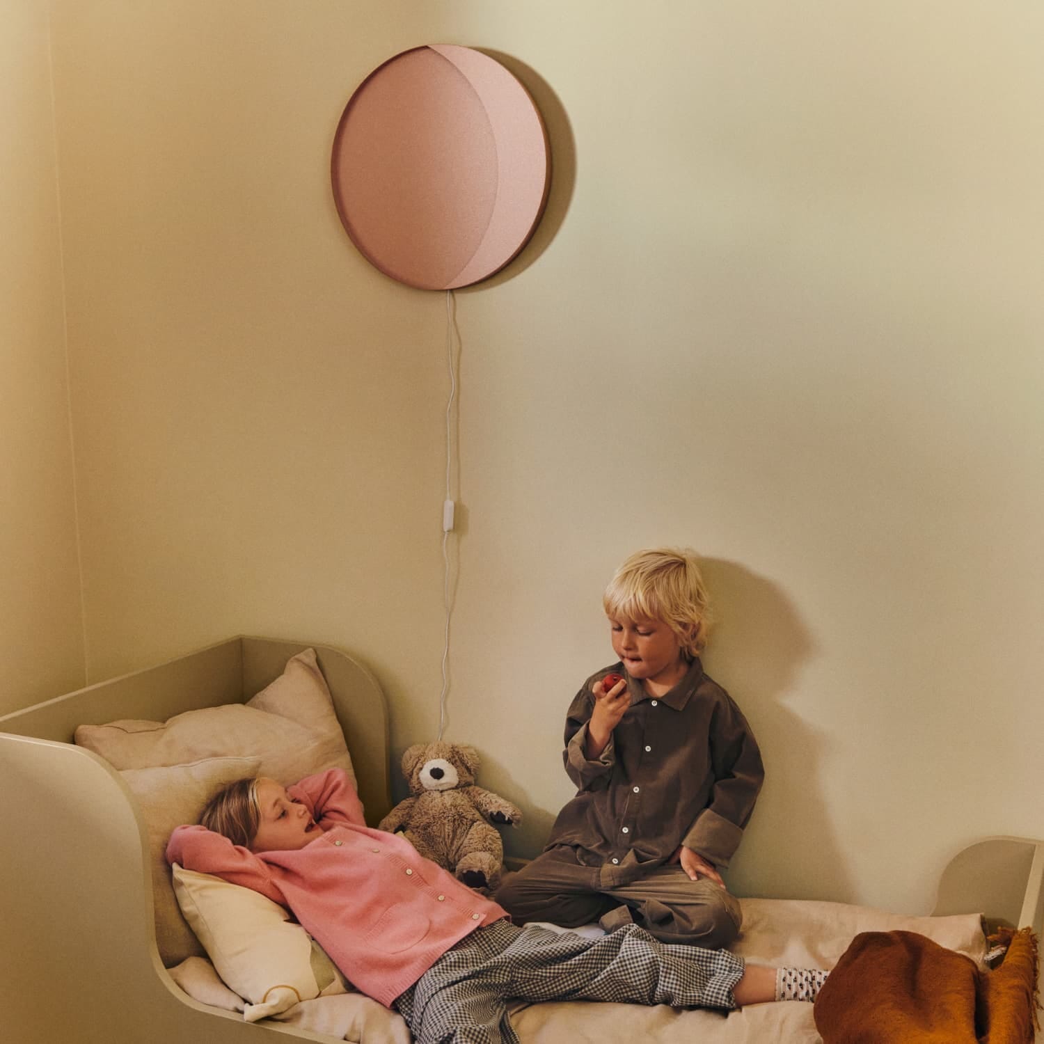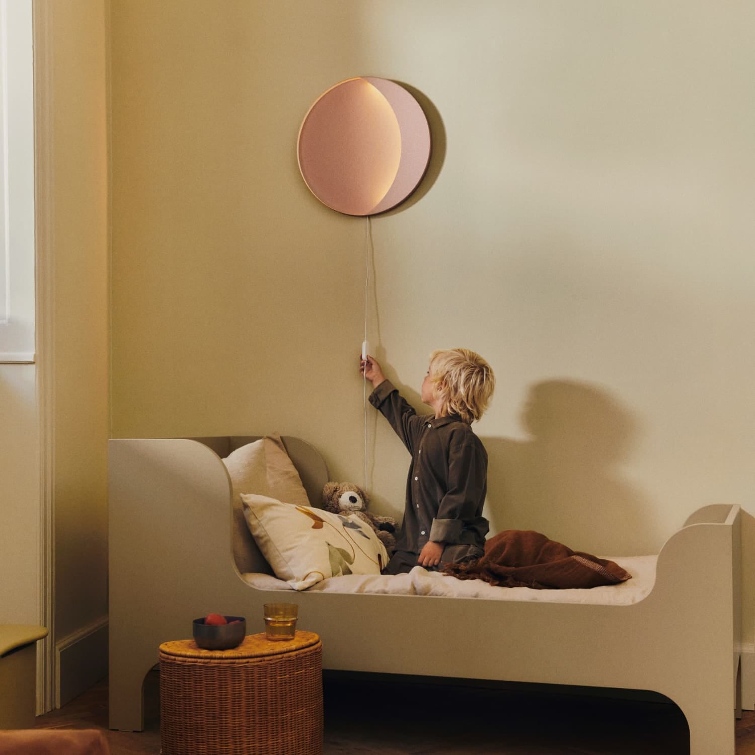Skap en drømmende stemning på barnerommet med Vegglampe Neba Rose – en poetisk lampe inspirert av månens myke silhuett.