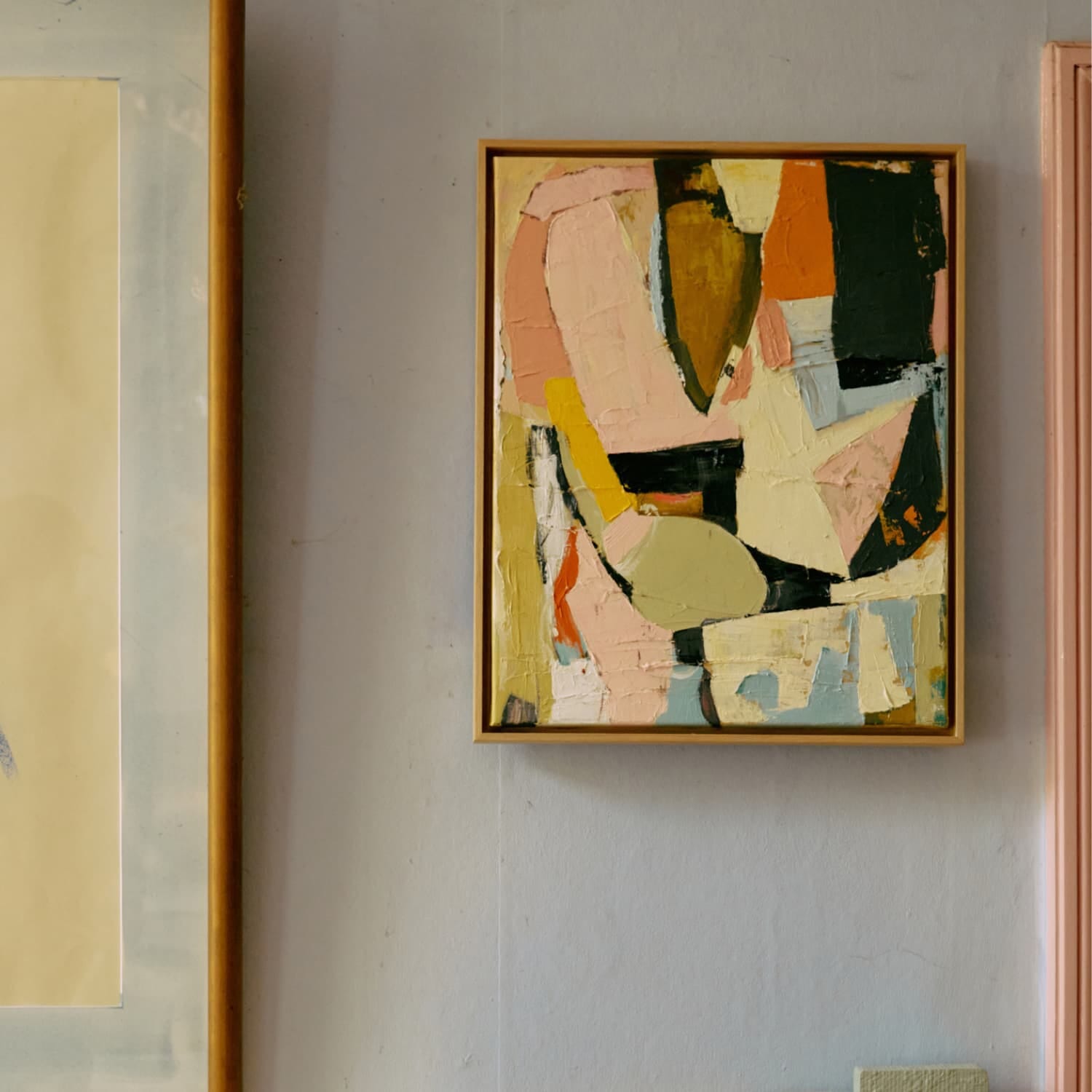 De korte, lagvise penselstrøkene i myke, blandede farger gir maleriet en subtil dybde som føles både uttrykksfull og harmonisk. Resultatet er et verk som tilfører varme og bevegelse til mindre rom eller intime kroker.