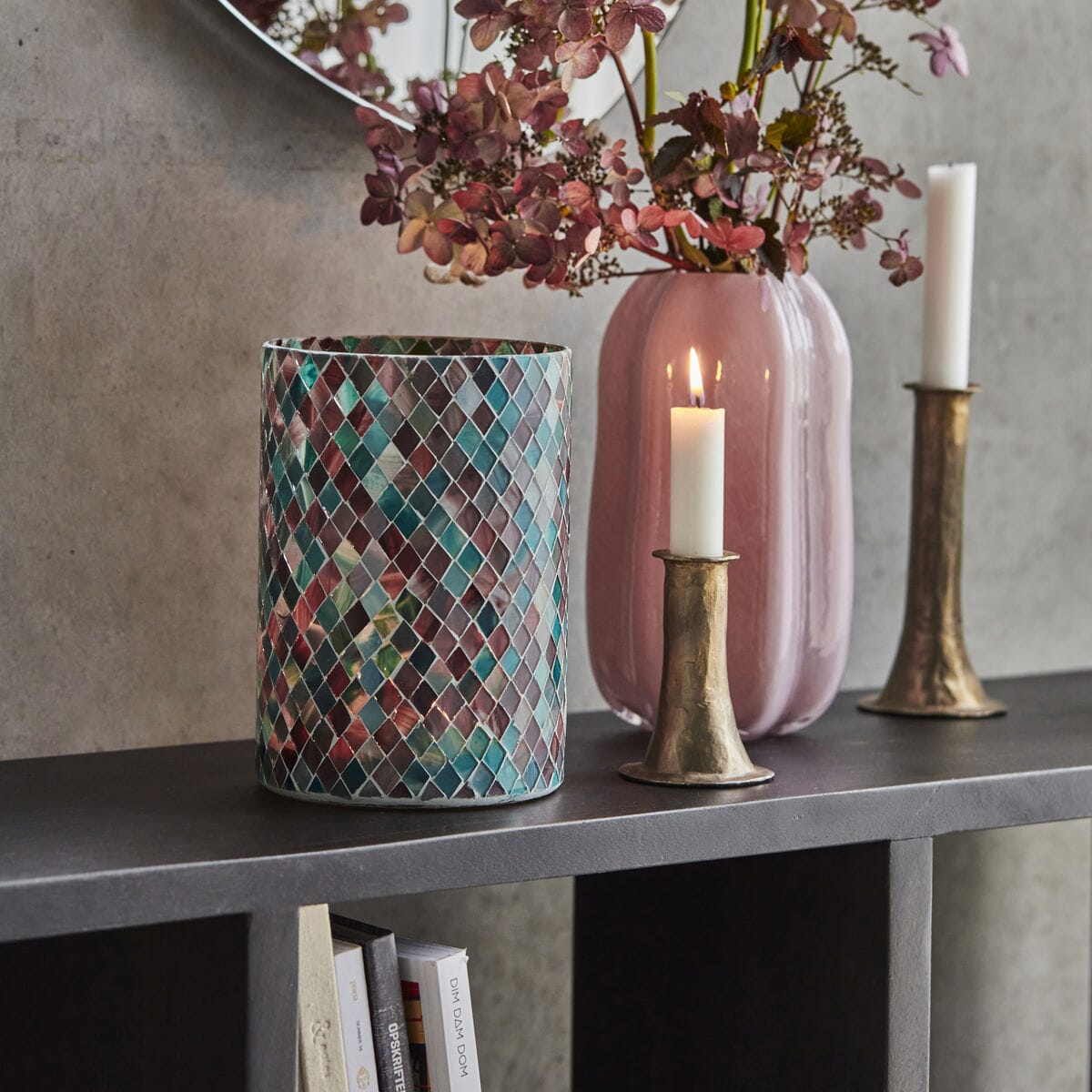 Suppler med fine farger og sjarm i stuen med denne telysholderen fra House Doctor. Det brune og grønne mønsteret er laget av mosaikk som gir en fantastisk kontrast til andre materialer og slankere overflater. Plasser telysholderen et sted som lar mosaikken skille seg ut eller sett den i vinduskarmen. Noen ganger er litt farge alt som trengs for å forvandle hjemmet ditt.