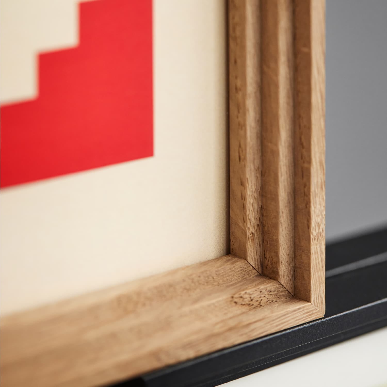 Materialvalget er både funksjonelt og varig: naturlig eik gir varme og karakter, mens akrylglasset og aluminiumskantene sørger for et lett og moderne preg. Plexiglasset er lett å rengjøre, og den enkle konstruksjonen gjør rammen like praktisk som den er vakker.