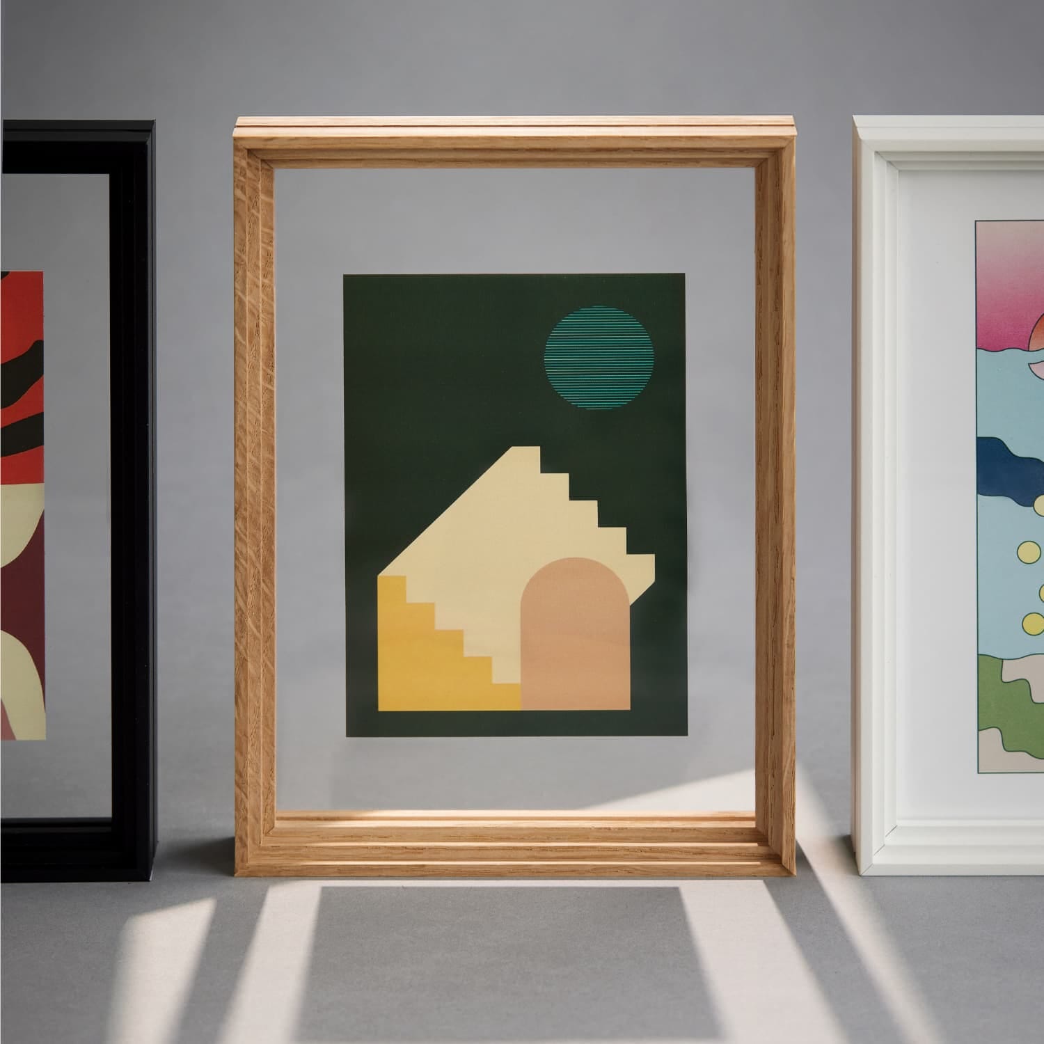 Rammen er bygget opp av fire sider i naturlig, FSC-sertifisert eik, to plater i akrylglass og et solid gummibånd som holder alt sikkert på plass. Den står stødig av seg selv, og kan plasseres på en hylle, et skrivebord eller en kommode der du ønsker å skape en personlig og varm atmosfære. Takket være den enkle løsningen kan innholdet byttes ut når du vil, slik at rammen kan følge sesong og stemning – fra minnerike fotografier til naturens små detaljer.