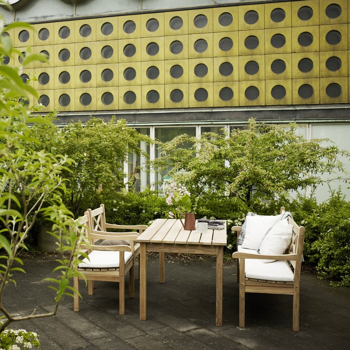 Hagemøblene er laget av ubehandlet teak-tre, kjent for sin motstandsdyktighet mot vær og vinn. Du velger selv om du vil la de vakre teak-plankene utvikle en sølvgrå patina over tid, eller vedlikeholder treverket med teakolje for å beholde den varme gløden.
