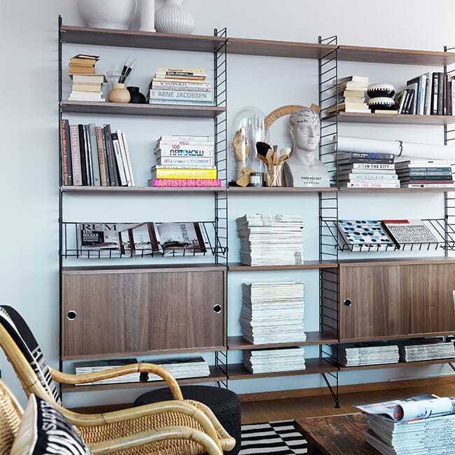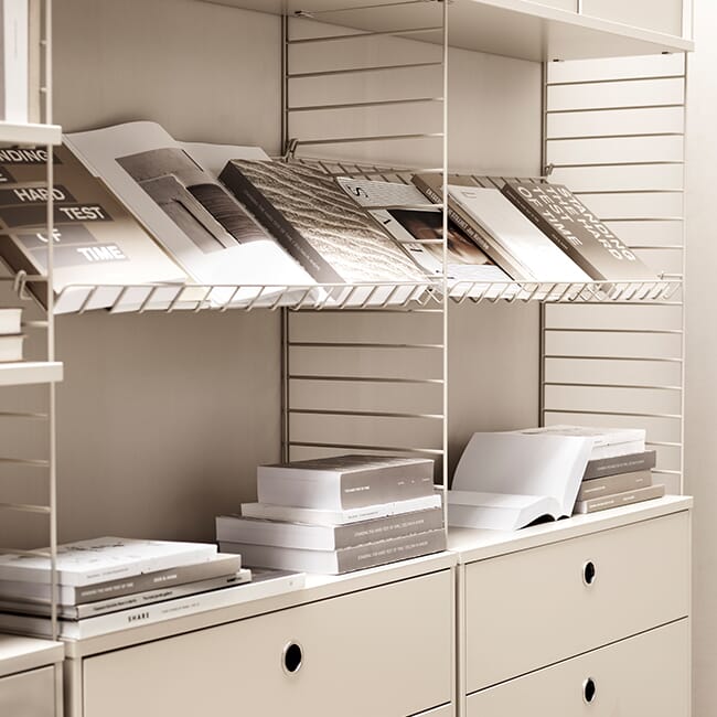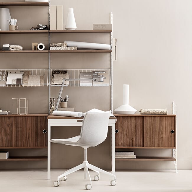 Materiale: Lakkert stål, lakkert MDF. Tre finér på variantene eik, sortlakkert ask og valnøtt. Tre er et levende materiale og kan derfor naturlig endre utseendet sitt over tid, spesielt når overflaten blir eksponert for direkte sollys.