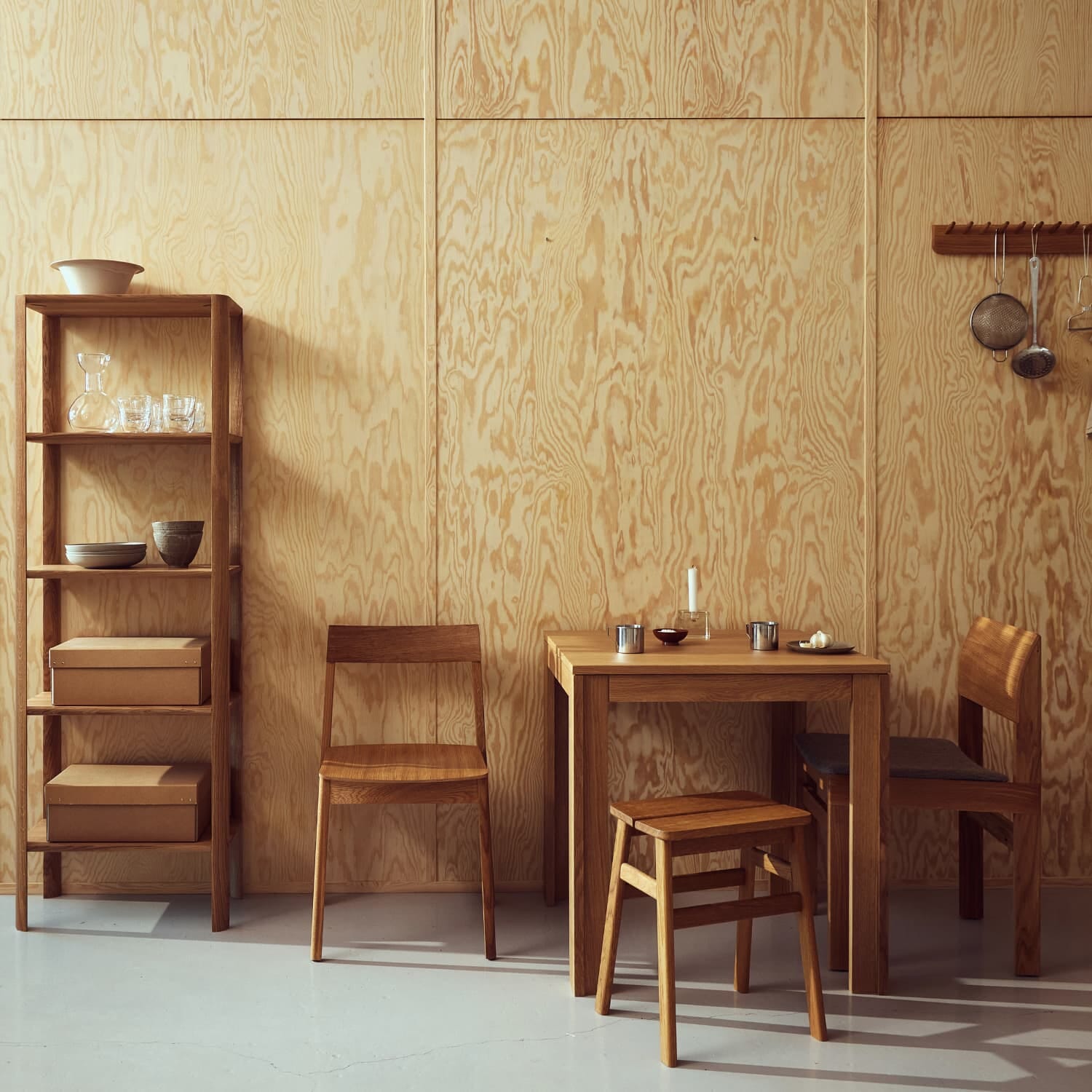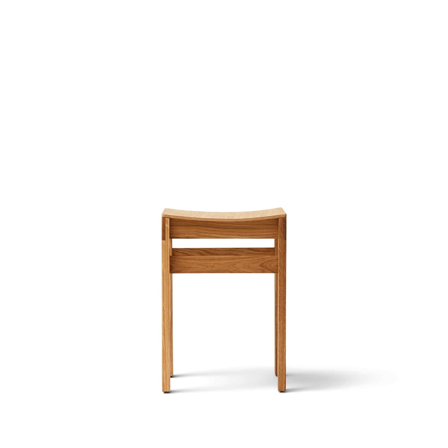 Setet i formpresset finer har en myk, U-formet kurve som gir overraskende god komfort til tross for stolens kompakte størrelse. Rammen er laget av FSC®-sertifisert europeisk eik, behandlet med naturlig olje som fremhever treets struktur og varme. Over tid vil krakken utvikle en vakker patina som gjør den enda mer karakterfull.
