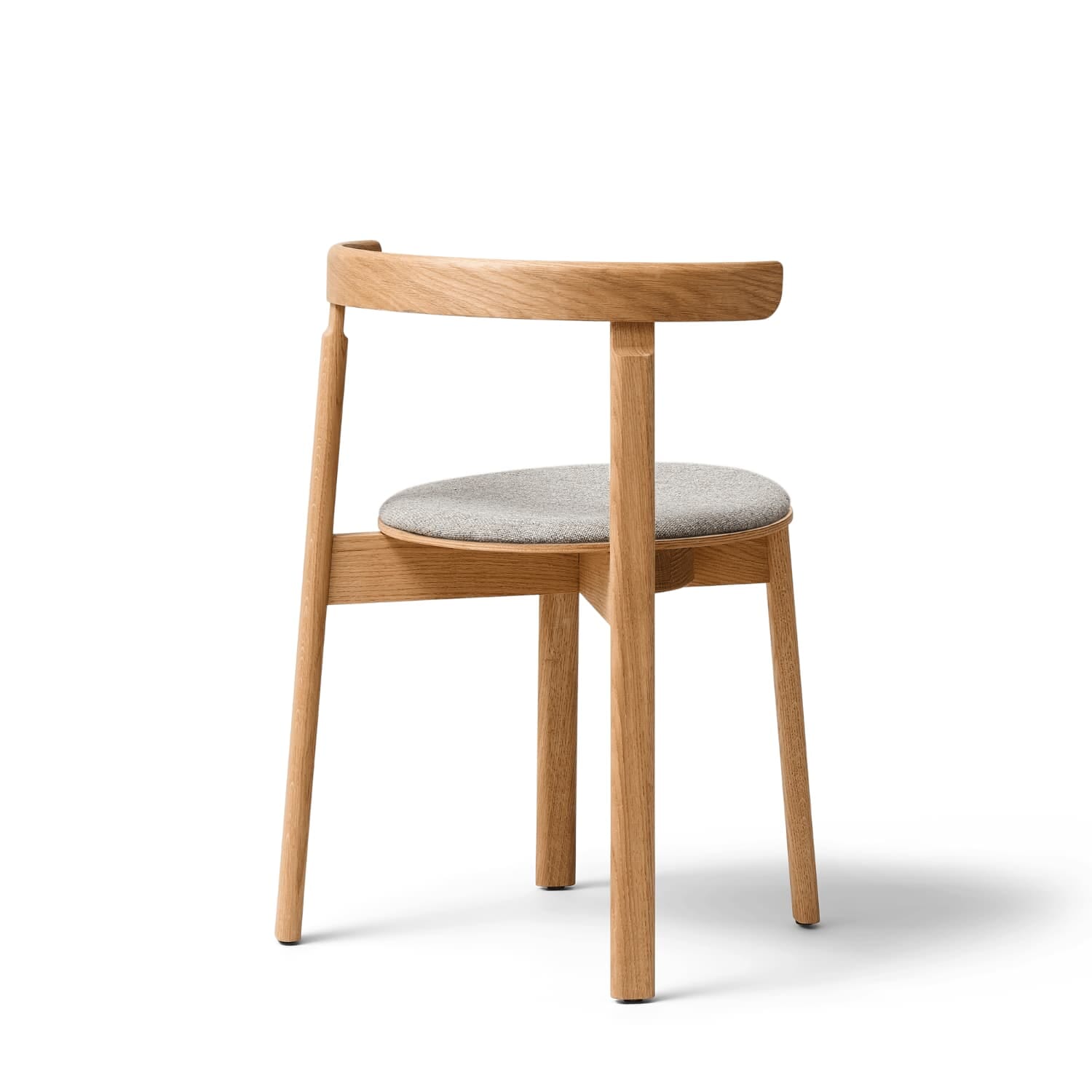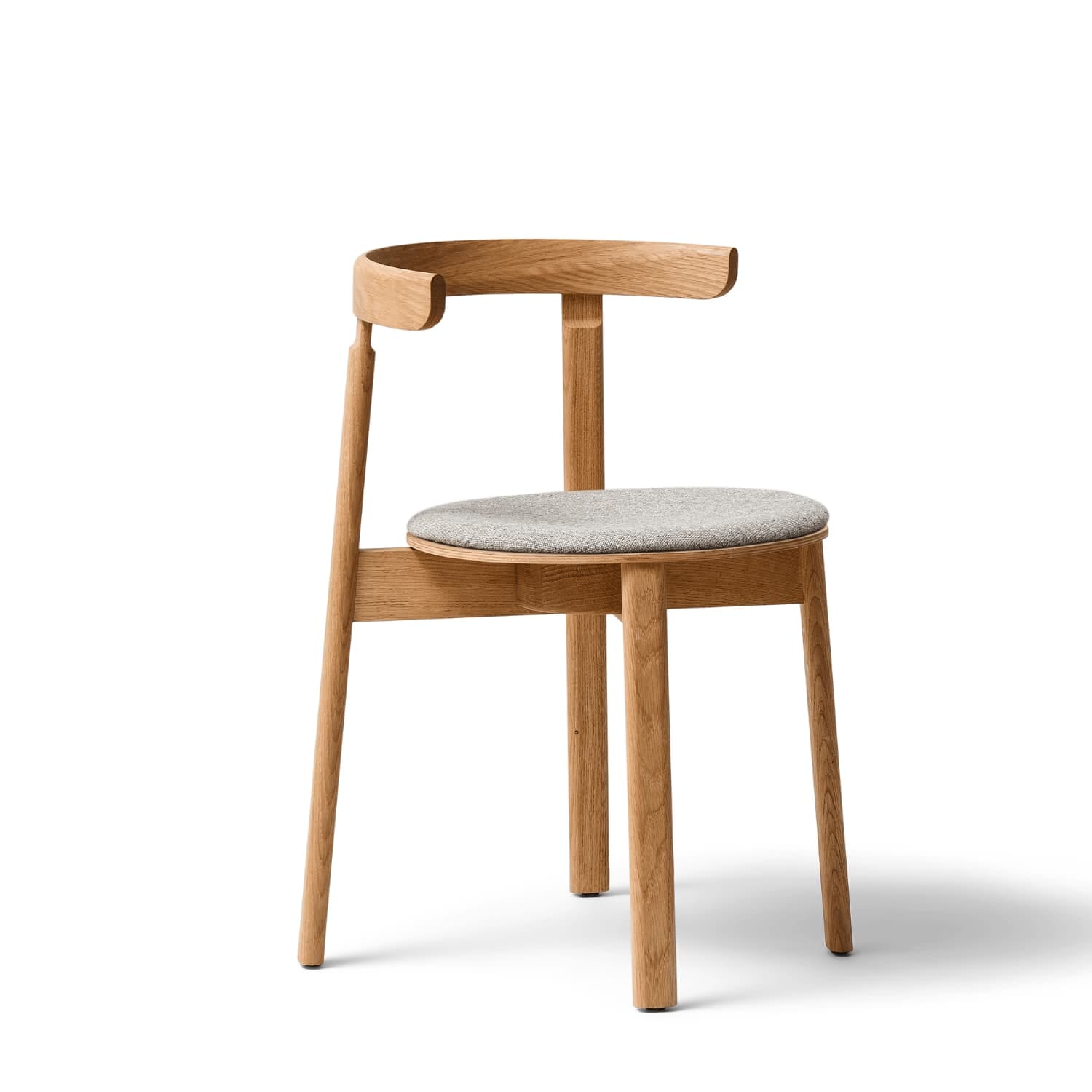 Det avrundede ryggstøttet med integrerte armlener er utskåret av ett stykke FSC®-sertifisert massiv eik, noe som gir optimal støtte til både rygg og albuer. Setet er polstret med brannhemmende skum og trukket i det ikoniske tekstilet Hallingdal 65 fra Kvadrat – en slitesterk kombinasjon av 70 % ull og 30 % viskose. Den sofistikerte fargen 0227 gir stolen et dempet, men eksklusivt uttrykk.