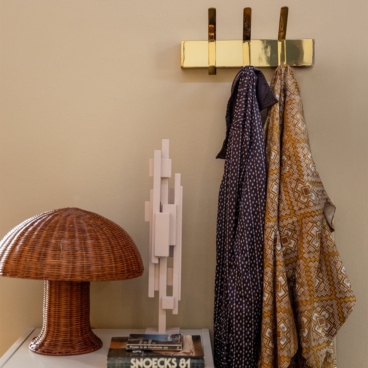 Oppbevar klærne dine med stil med denne kleskroken i messing. Det enkle og moderne designet gir en stilig kontrast til det luksuriøse messingmaterialet. Den mellomstore versjonen gir rikelig hengende plass uten å ta for mye plass.