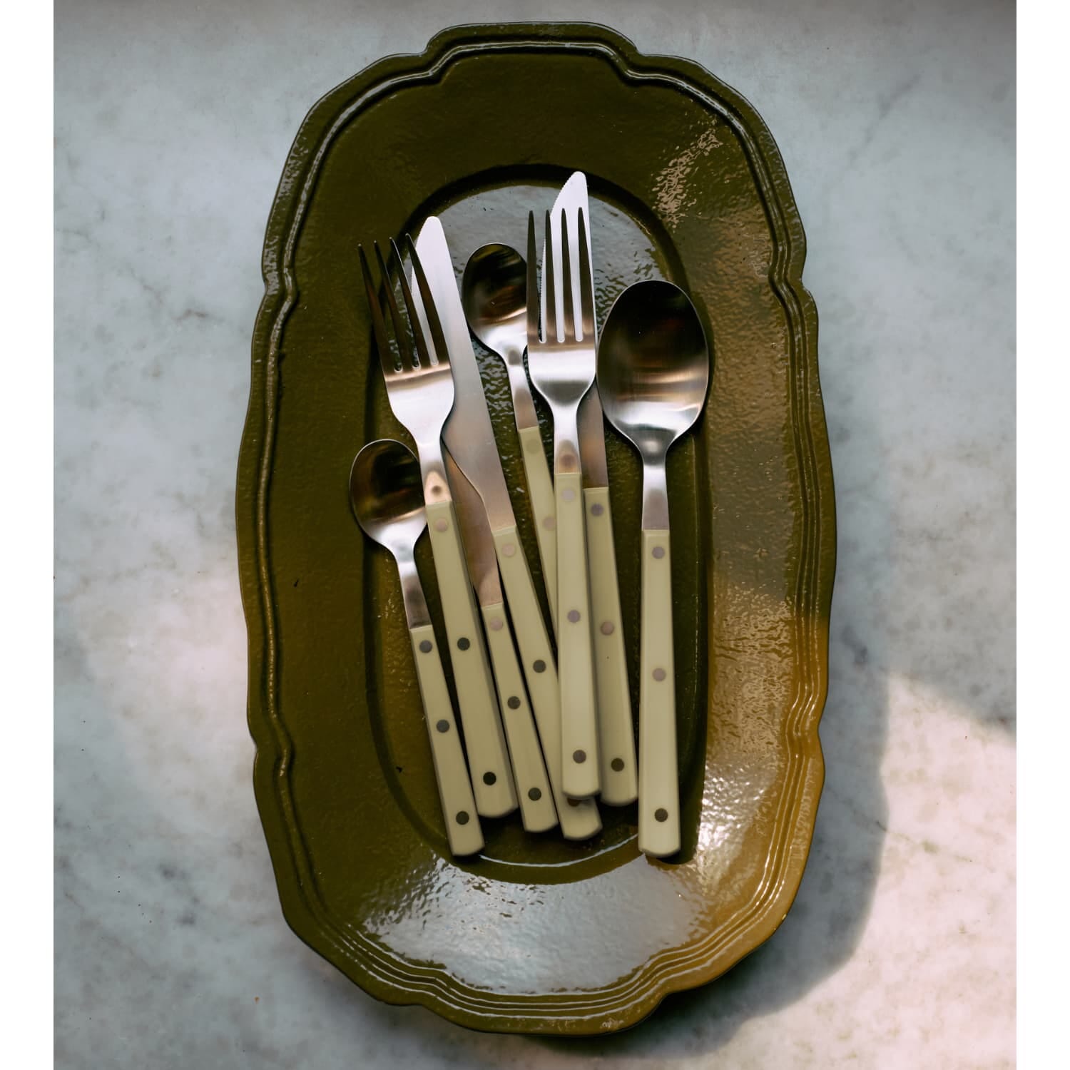 Utført i metall med en jevn, olivengrønn finish, fremstår brettet både jordnært og elegant – et design som løfter enhver servering med sitt enkle, men sofistikerte uttrykk.