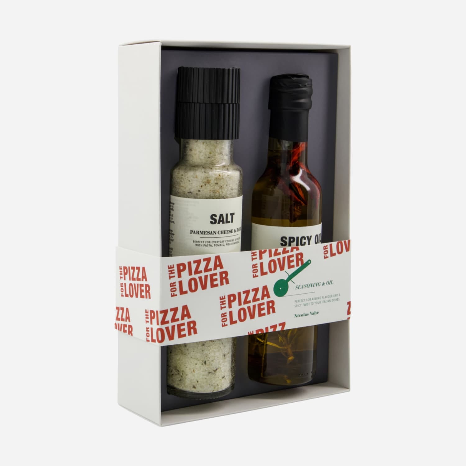 Denne lekre esken inneholder to nøye utvalgte produkter som tilfører både aroma og karakter til hjemmelaget pizza: en krydret olje og et smakfullt salt, perfekt balansert for å løfte hver bit.