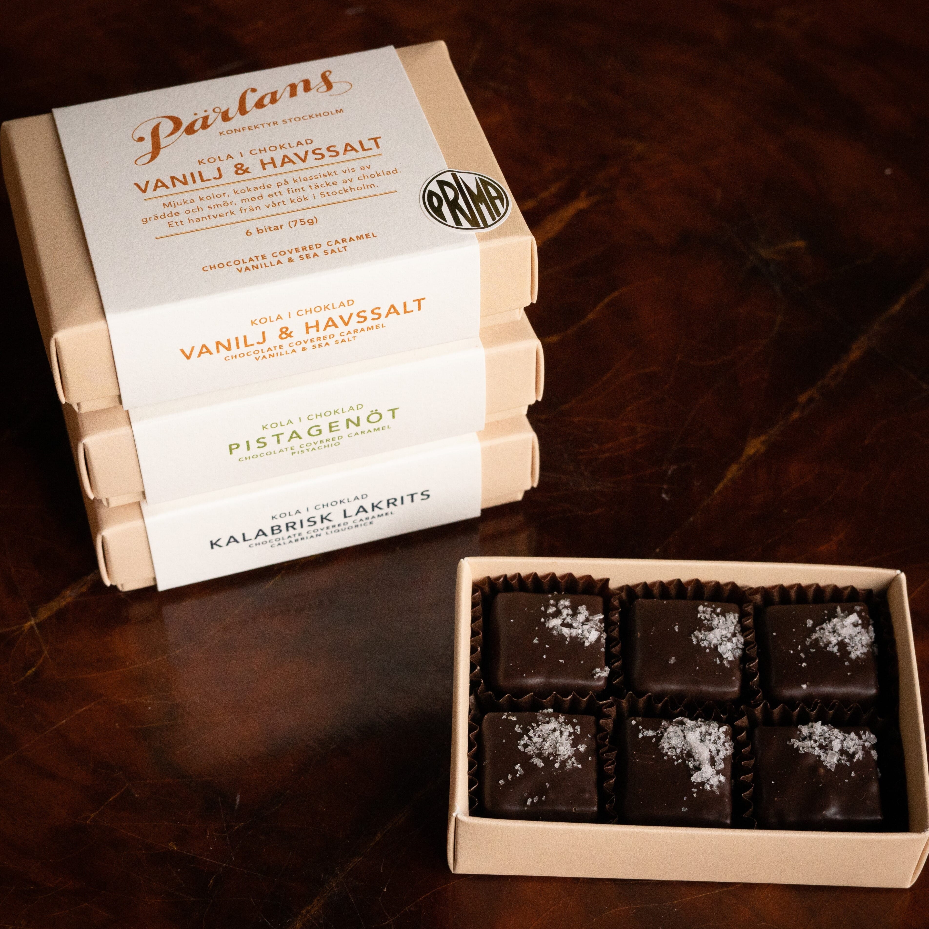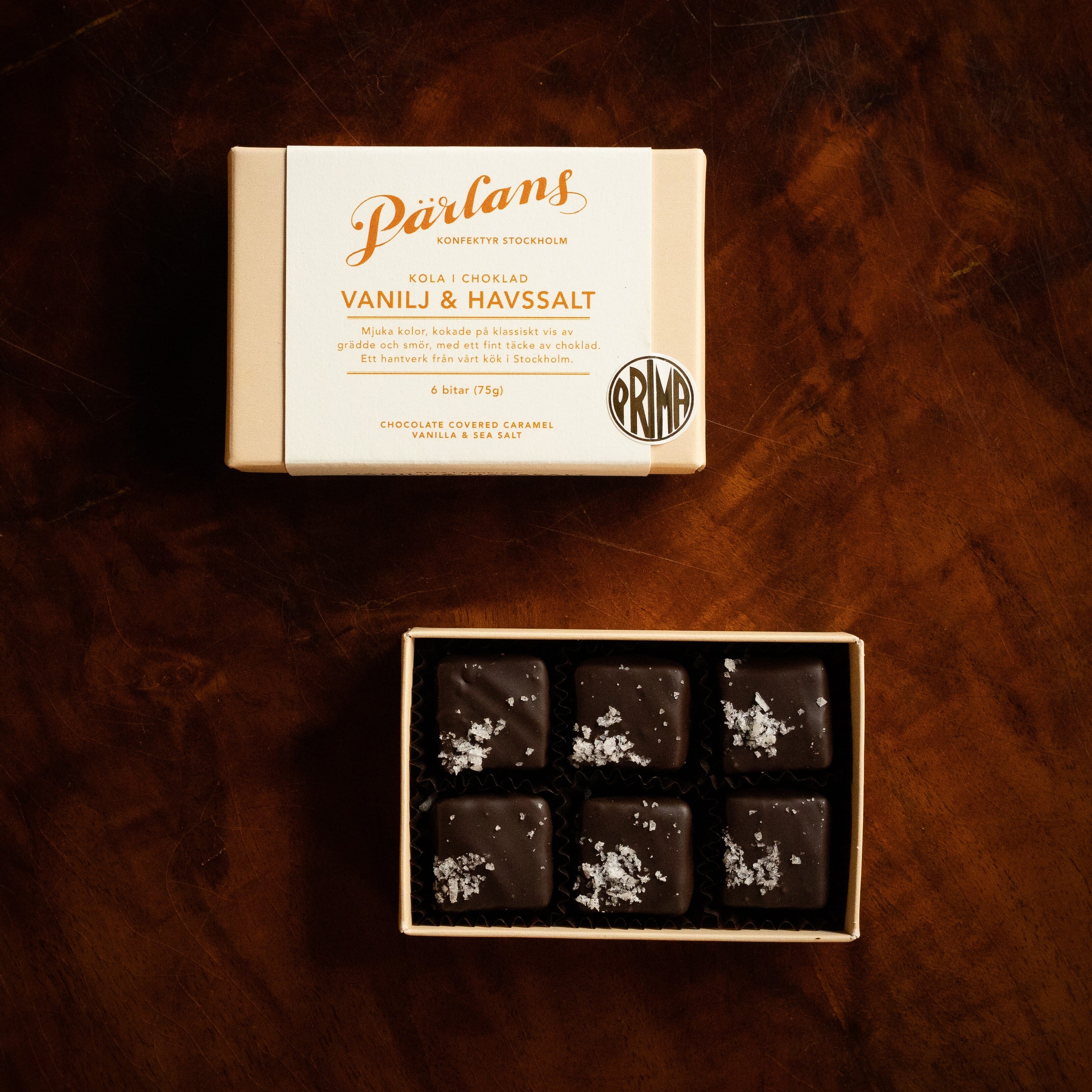 VANILJE & HAVSALT - Denne silkemyke karamellen er krydret med bourbonvanilje, dratt i deilige sjokolade og toppet med en ekstra porsjon havsalt. En tidløs favoritt som aldri går av moten.