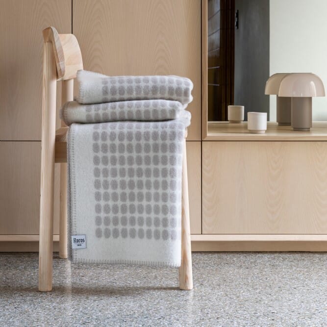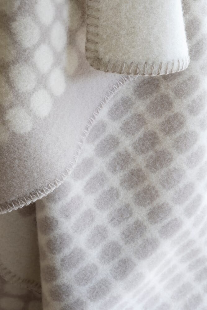 Selv om mønsteret er vevd inn i pleddet, kan det nesten se ut som det er trykket på den myke overflaten og gir assosiasjoner til klassiske teknikker som sjablong, silketrykk, litografi, raster og blokktrykk.