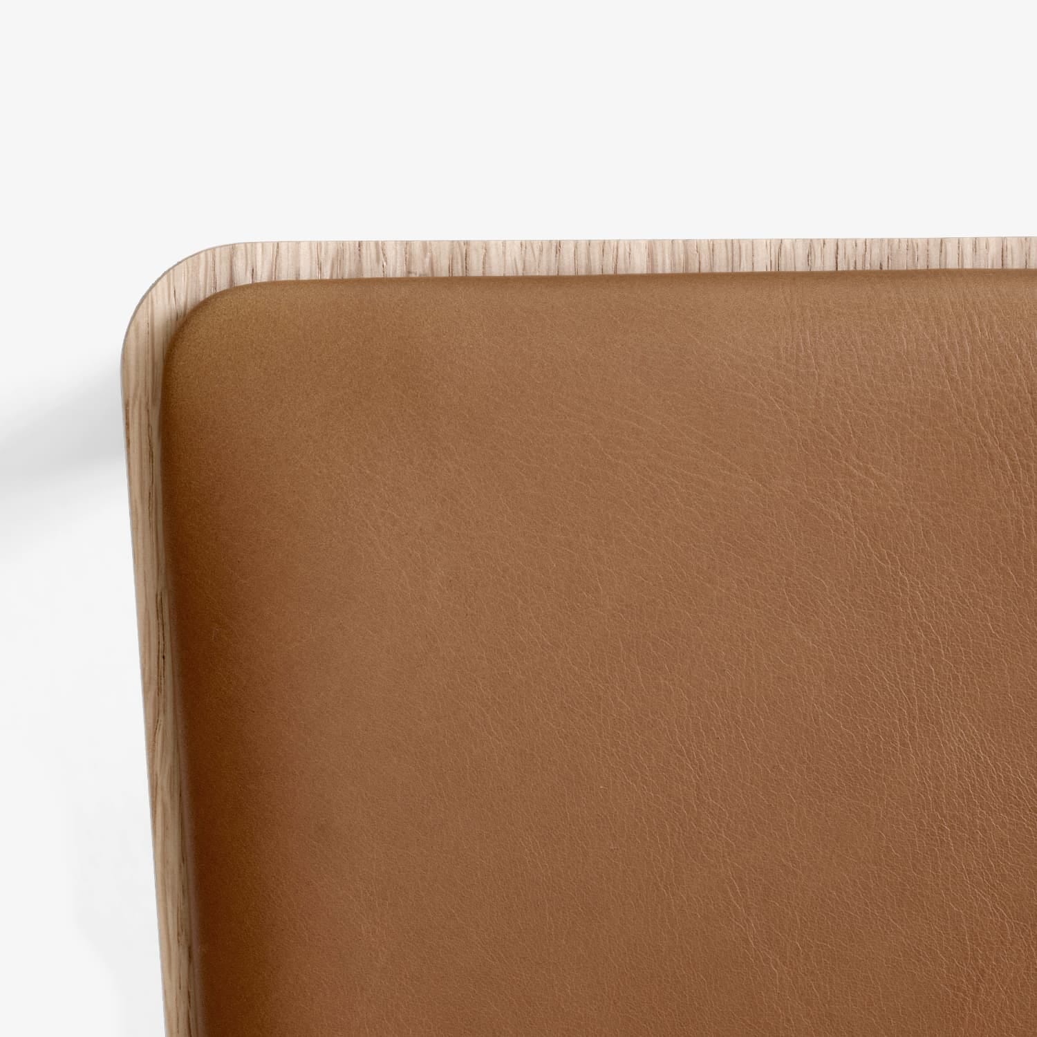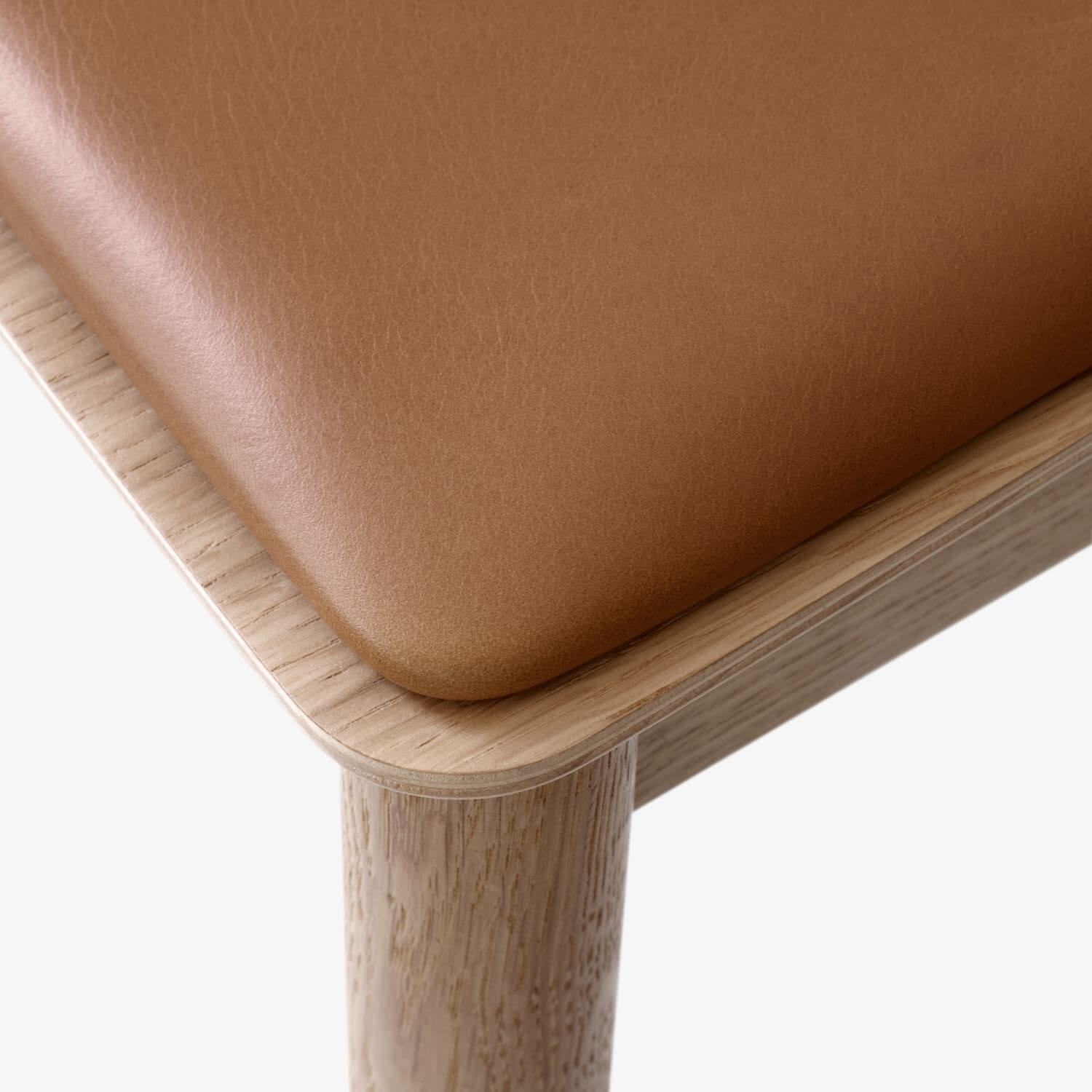 – Materiale: Massiv lakkert eik, formpresset finer, HR-skum, polstring i cognac anilinskinn