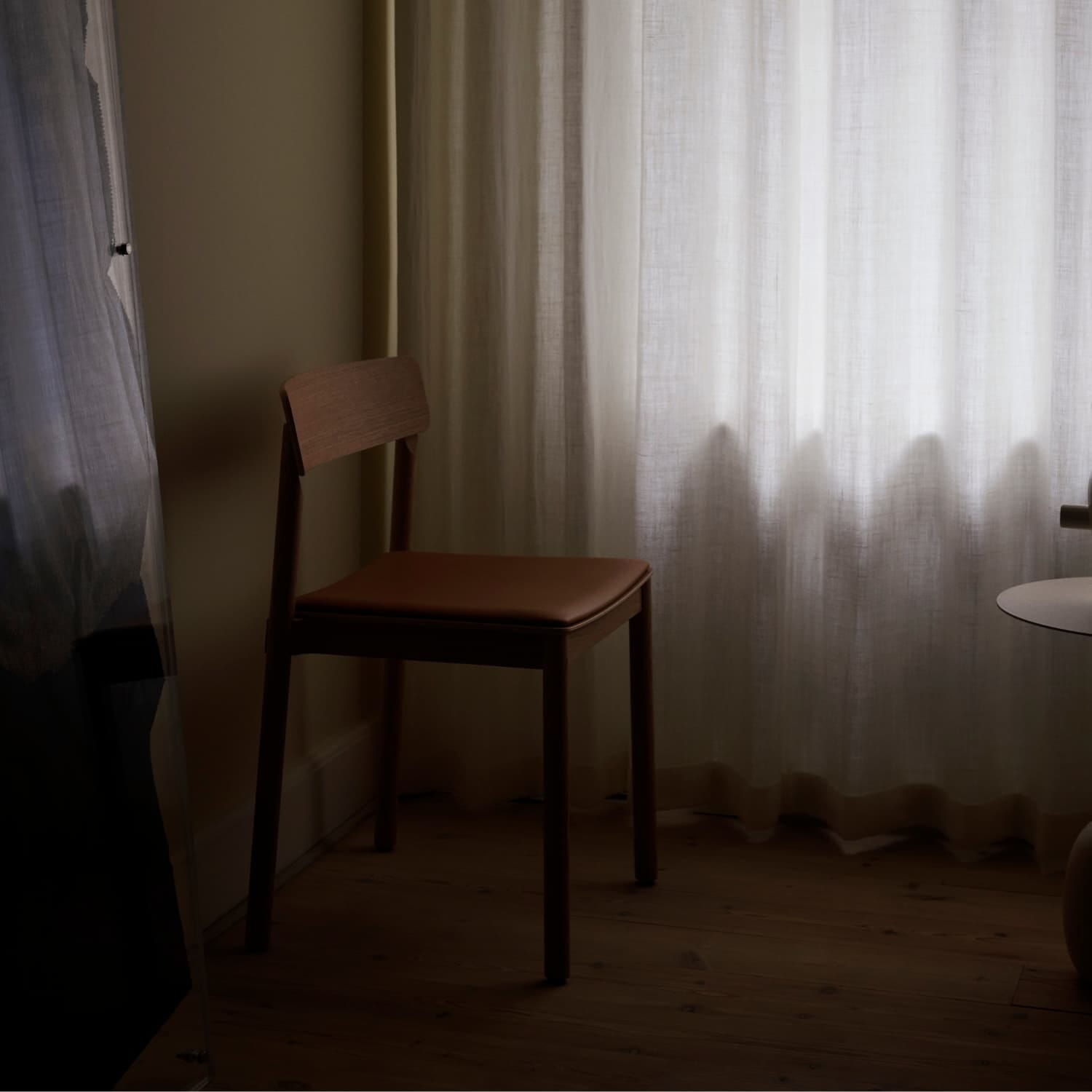 Rammen i massiv, lakkert eik og rygg i formpresset finer gir stolen et varmt og naturlig uttrykk som passer inn i både moderne og klassiske hjem. Setet er polstret med HR-skum og trukket i cognacfarget anilinskinn, et eksklusivt materiale som er kjent for sin mykhet, pusteevne og evne til å utvikle en vakker patina over tid. Resultatet er en stol som ikke bare er behagelig å sitte i, men som også får mer karakter jo mer den brukes.