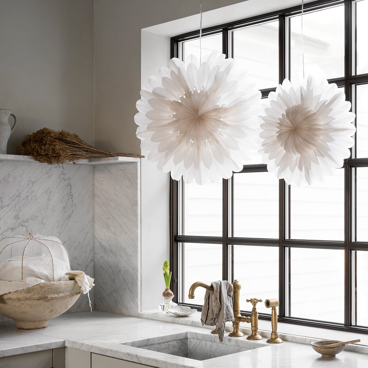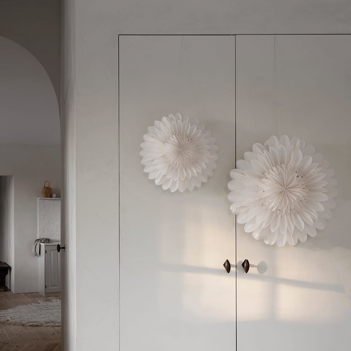 Med sin runde form og avrundede hjørner er Lotus en unik og moderne vri på den klassiske papirstjernen. Lyset skinner gjennom det transparente, lyse papiret slik at de bølgende kurvene virkelig kommer til live. Julestjernen er nøye brettet og limt for hånd slik at den skal holde fasongen i år etter år. Leveres i en elegant oppbevaringsboks som også egner seg som gaveboks.