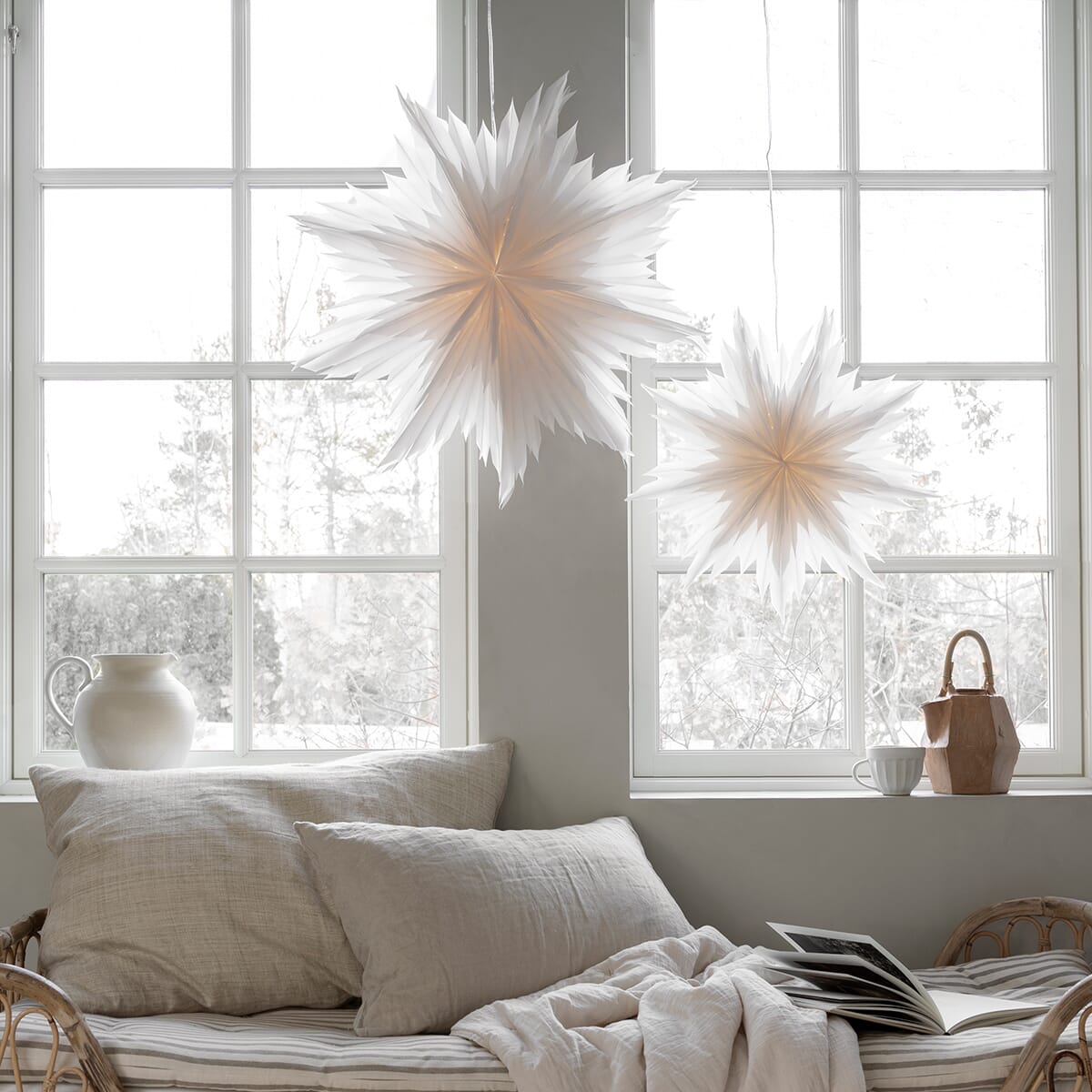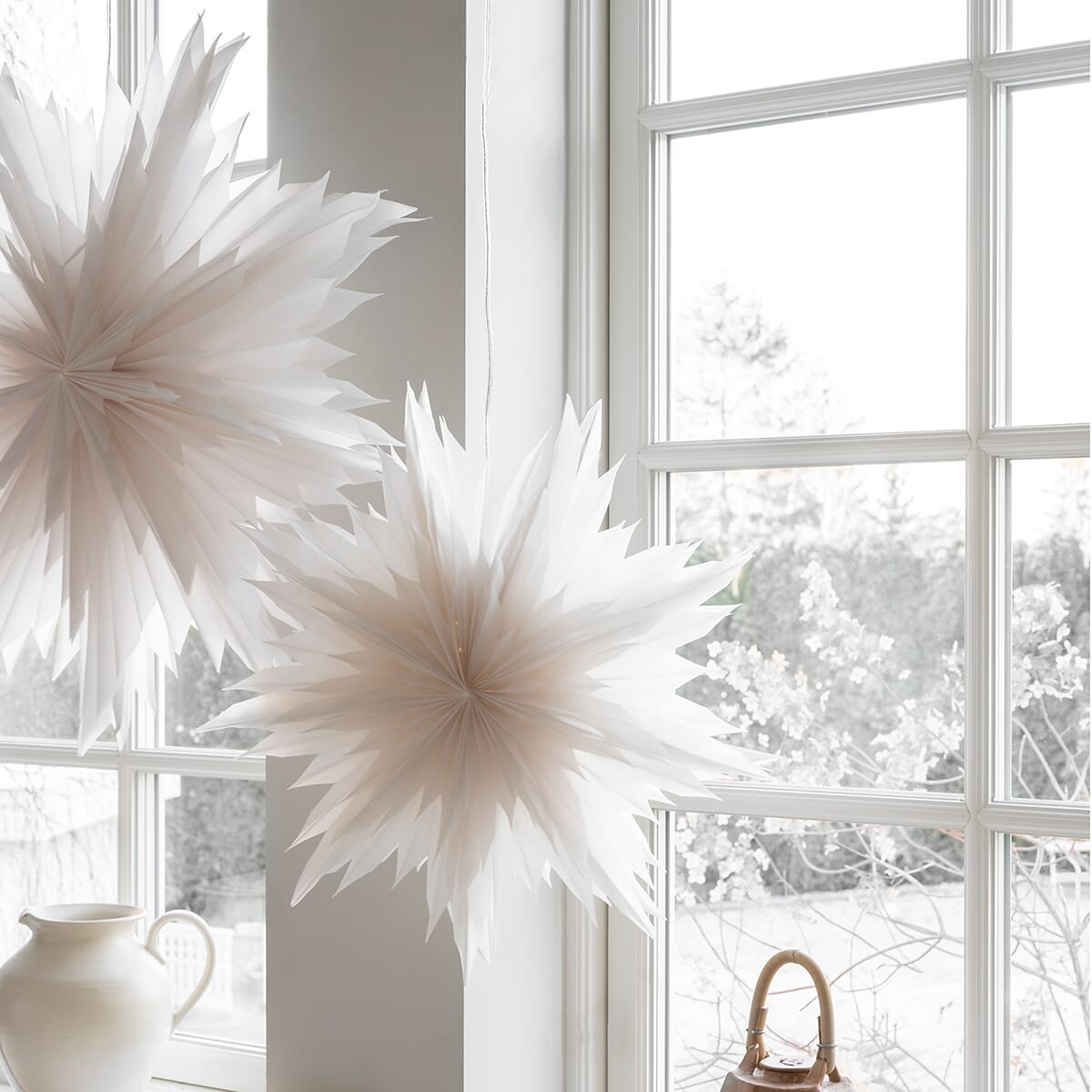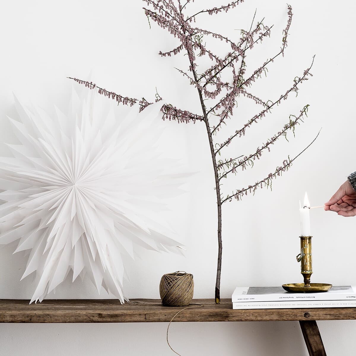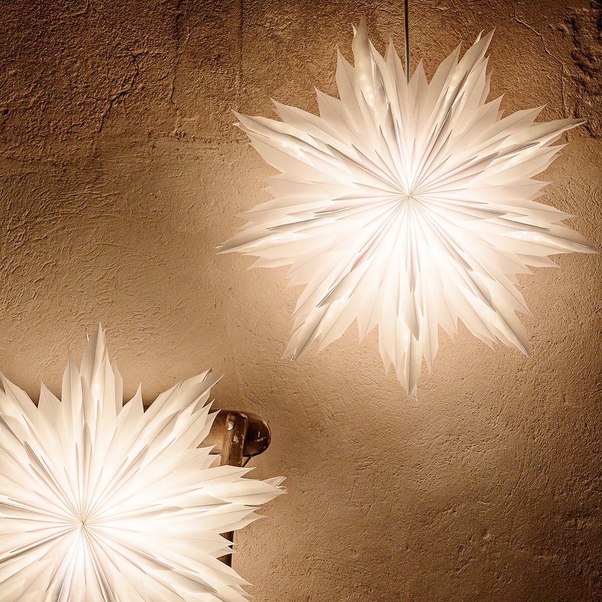 Den kjente Oslo-stjernen fra Watt & Veke er som en etterlikning av nordiske fjelltopper. Helt til stjernen lyser, da minner den om en dramatisk vintersolnedgang. Den er brettet for hånd av transparent papir og limet er tilpasset det nordiske klimaet slik at fasongen bevares sesong etter sesong. Leveres i en elegant oppbevaringsboks som også egner seg som gaveboks.